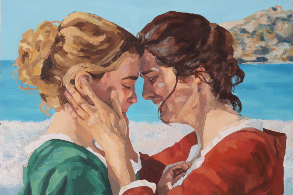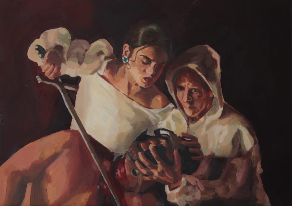 La relación entre el cine y la pintura ha sido, desde el principio, un hilo conductor en mi trayectoria como artista plástica e investigadora. Plasmo en mis obras imágenes inspiradas en fotogramas de películas, series y vídeos musicales, cuyas iconografías se basan en la propia historia de la pintura. Sus protagonistas son mujeres que me inspiran por sus fortalezas, ya sean físicas, intelectuales o sentimentales. La creación de esta obra supone un apasionante juego de espejos entre dos prácticas artísticas que utilizan el tiempo y el espacio de forma diferente, valorando el potencial semántico y pictórico de las imágenes fílmicas, invitándome a contemplarlas y reinterpretarlas pictóricamente.