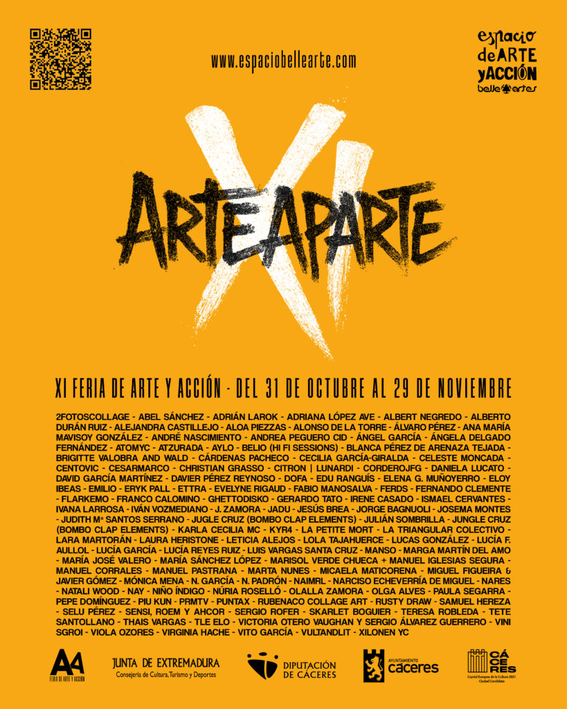 El espacio Belleartes ha publicado la lista de propuestas seleccionadas para participar en la XI Feria de arte y acción Arte Aparte 2025 que se desarrollará en Cáceres del 31 de octubre al 29 de noviembre, en Espacio Belleartes (Cáceres) y en cuatro pueblos del Valle del Ambroz